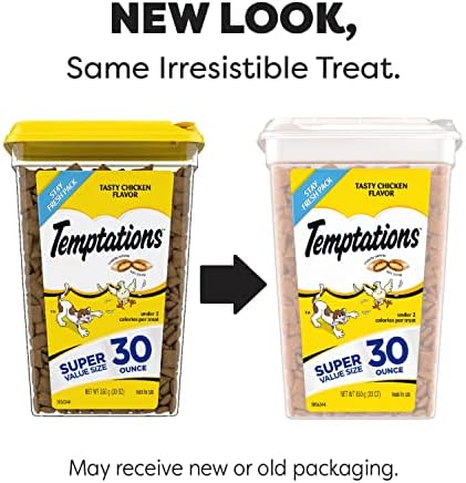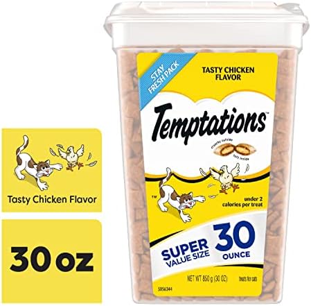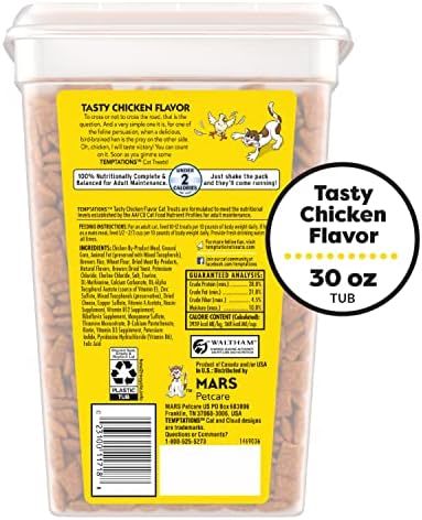 About this item Contains one (1) 30 oz. tub of TEMPTATIONS Classic Cat Treats Tasty Chicken Flavor Your cat can’t wait to get their paws on these scrumptious cat food treats that are crunchy on the outside and soft on the inside Under 2 calories per chicken flavor cat treat, so you can feel good about rewarding your cat every day TEMPTATIONS Cat Treats are 100% nutritionally complete and balanced for adult cat maintenance and can be used as a treat, meal, or cat food topper Treat ’em again and again with this super value-sized resealable tub: perfect for keeping cat paws off when you’re not watching America’s Cat Treat Brand just shake the pack and they’ll come running Based on 2019 Nielsen sales data